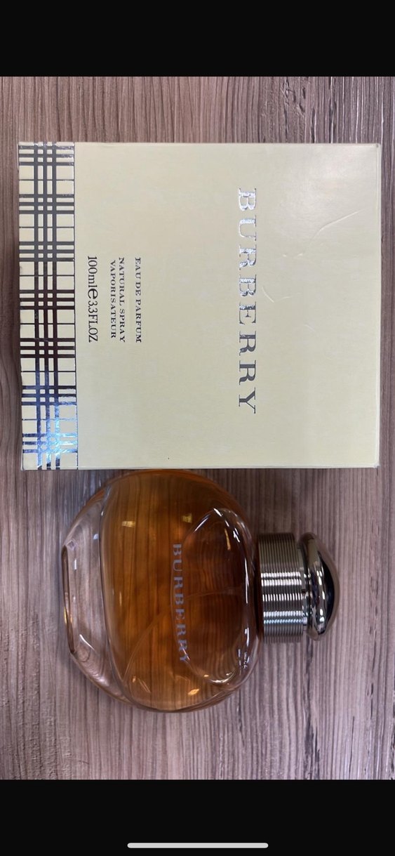 Burberry kadın parfümü, 100 ml hacminde, şeffaf cam şişede ve metalik kapaklı. Eau de Parfum konsantrasyonu ile kalıcı koku sunar.