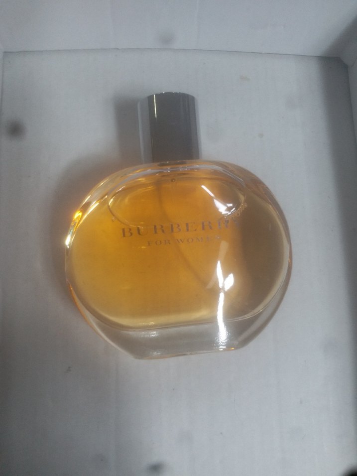 Burberry kadın parfümü, gümüş kapaklı yuvarlak şişede sıcak amber renkli koku içerir.