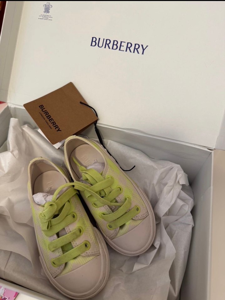 Sarı pastel renkli, baskılı detaylı kız çocuk spor ayakkabısı. Kauçuk tabanlı ve cırtcırtlı, Burberry marka trendy sokak stili için uygun.
