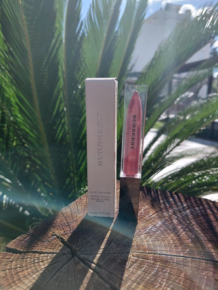 Burberry markalı bej pastel tonlarda, doğal görünümlü parlak dudak parlatıcısı. Ambalajda Burberry logosu yer alır.