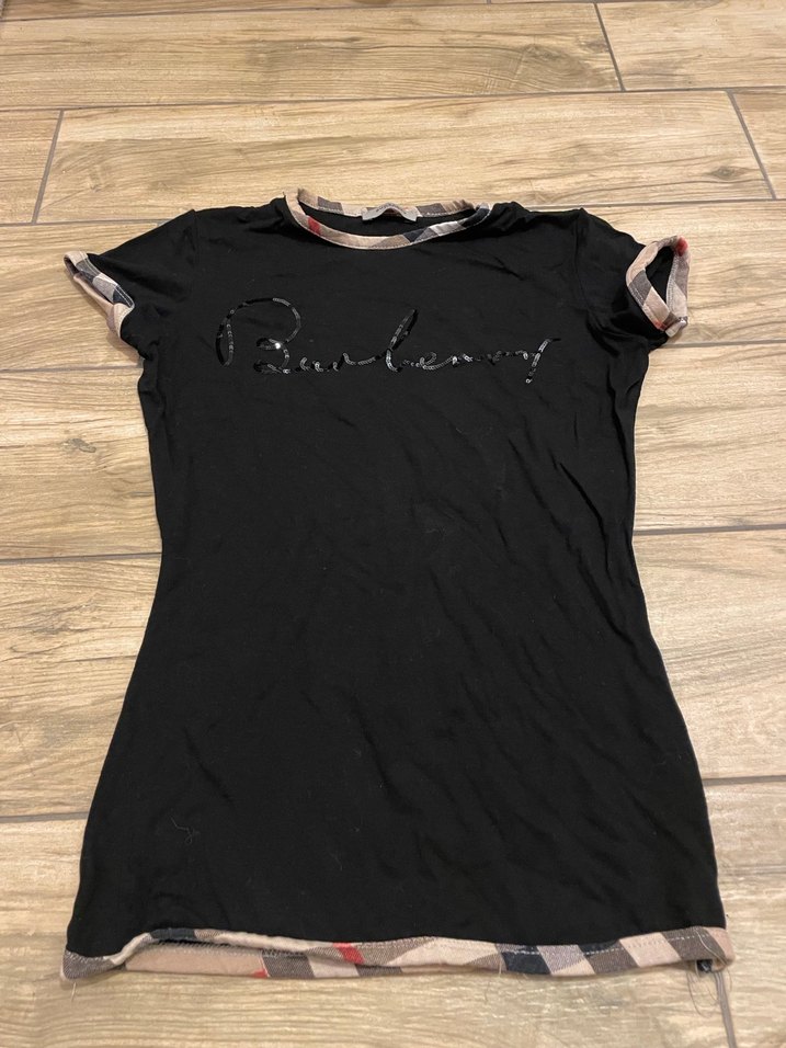 Pamuklu, siyah, baskılı, kısa kollu, fitted kesim tişört. Yaka ve kol uçlarında Burberry'e özgü ekoseli detaylar bulunur. Günlük kullanıma uygun. Orijinal değildir. S ve xs bedene uygundur. Sol alt kısımda ip atması vardır. Kullanıma engel değildir.