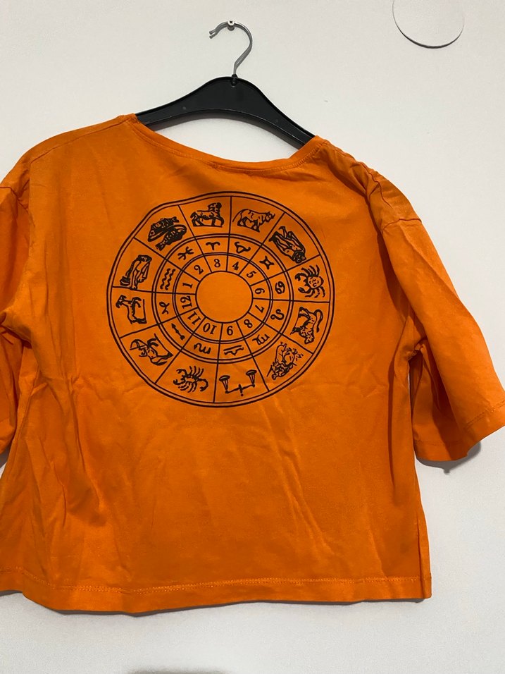 Turuncu, parlak sentetik kumaştan, bol kesim ve baskılı burç desenli, kısa kollu yuvarlak yaka kadın tişörtü.