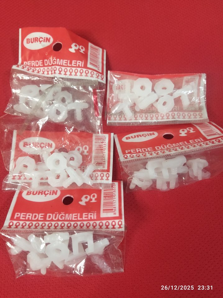 Burçin marka, elastik özellikli plastik perde düğmeleri. Beyaz renkli ve baskılı desenli, mini boy ve sıkı uyumlu tasarıma sahip.