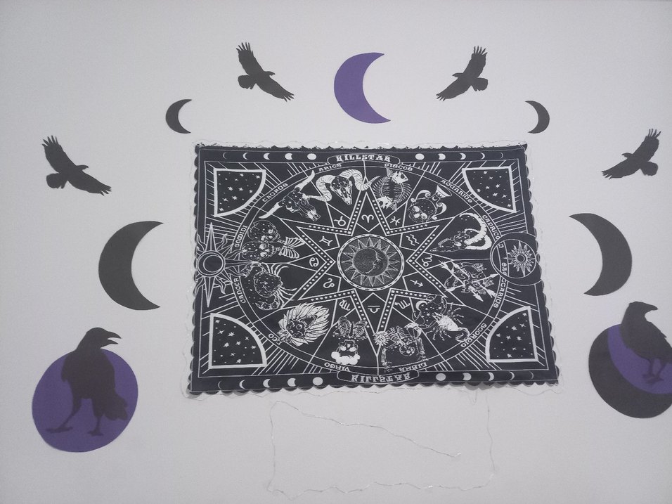 Burç sembolleri ve ay evrelerini içeren siyah beyaz astroloji temalı duvar örtüsü.