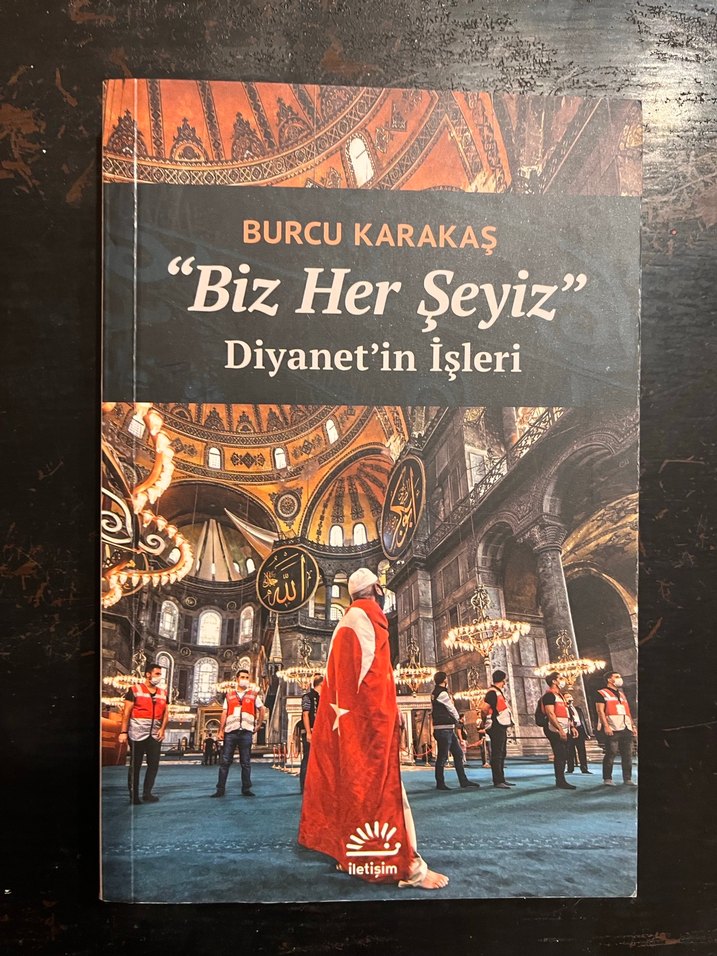 Burcu Karakaş'ın "Biz Her Şeyiz" adlı kitabı, Diyanet'in işlerini ele alıyor. Kapakta Türk bayrağıyla bir kişi ve tören kıyafetli askerler bulunuyor.