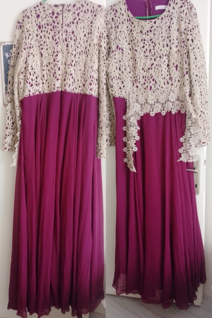Bordo renkli, uzun dantel kollu ve işlemeli detaylara sahip, bol kesim kadın elbisesi. Klasik şıklık için uygun, düğünlerde tercih edilir.