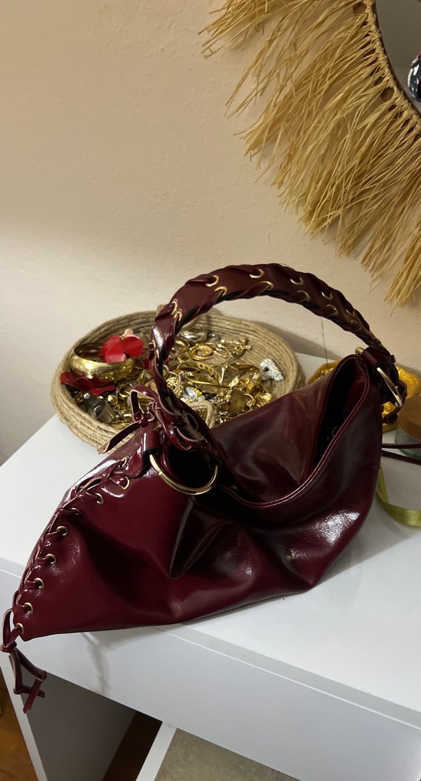 Bordo deri yılan desenli kadın çanta, tokalı detaylarıyla bohem tarzı yansıtıyor. Günlük kullanıma uygun, retro Paris havası taşıyor.