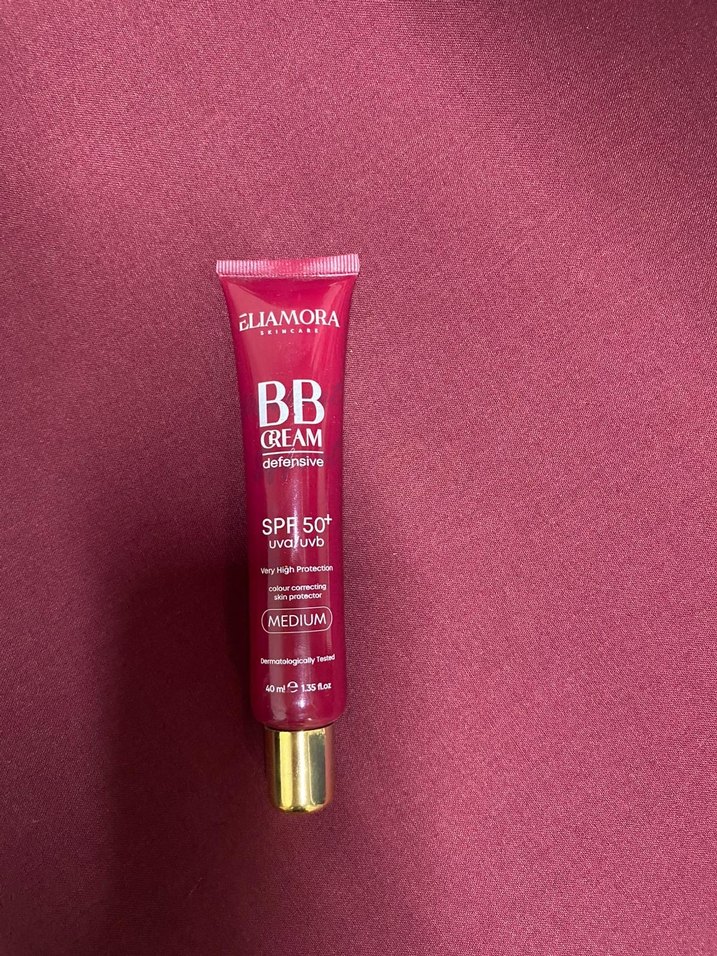 Bordo renkli BB krem SPF 50 koruma sağlar, orta tonludur. Renk düzeltme ve cilt koruması sunar.