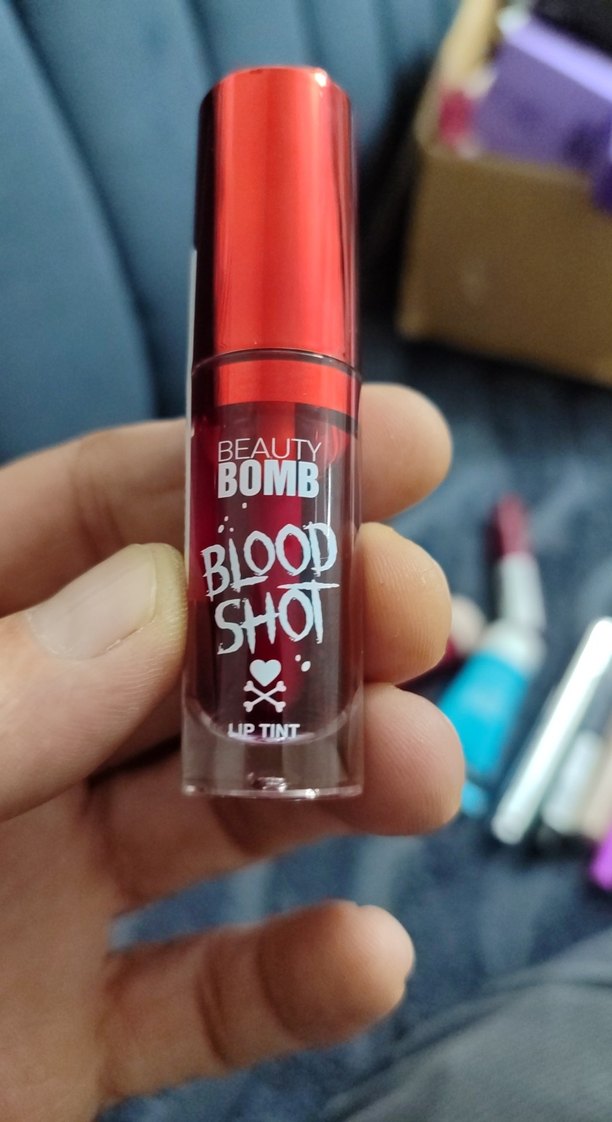 Beauty Bomb markasına ait, canlı renk veren bordo dudak parlatıcısı. Blood Shot ve Lip Tint olarak etiketlenmiştir.