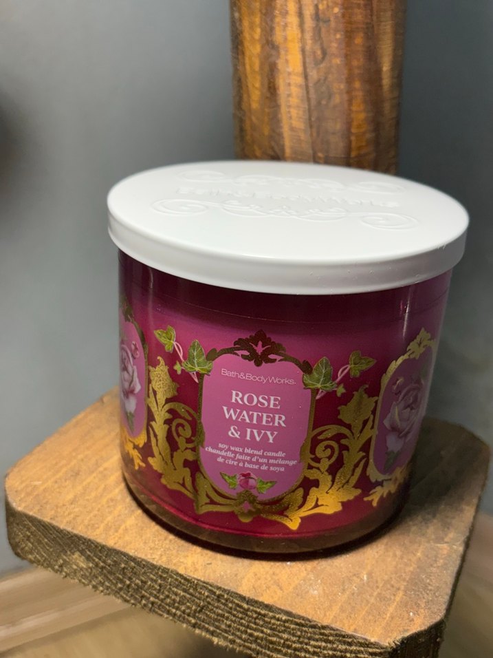 Bath & Body Works markalı bordo renkli Rose Water & Ivy kokulu mum, beyaz kapaklı süslü cam kavanozda sunulmaktadır.