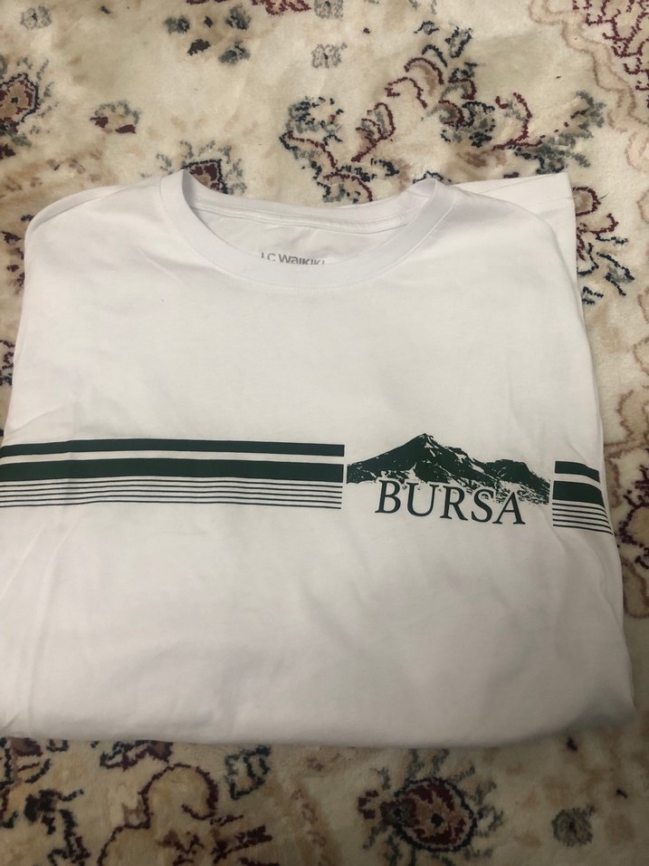Beyaz pamuklu erkek tişörtü, yuvarlak yaka ve kısa kolludur. Üzerinde koyu renk 'Bursa' baskısı ve çizgiler bulunur. Rahat kesimlidir.