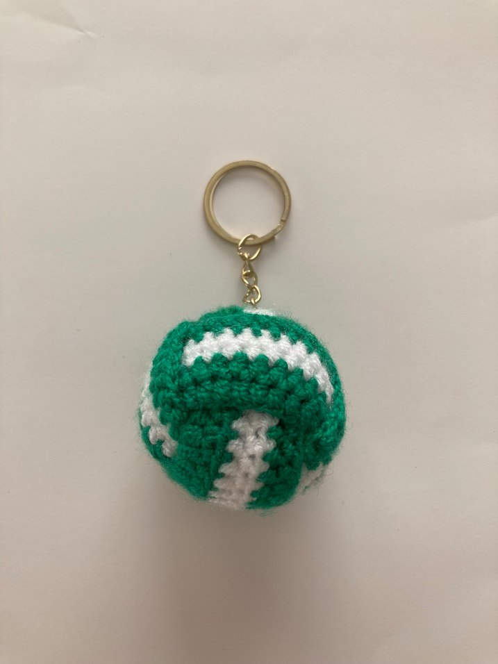 Örgü yeşil ve beyaz renklerde, sokak giyimine uygun renkli ve rahat tasarımlı anahtarlık. Basit ama şık bir aksesuar.