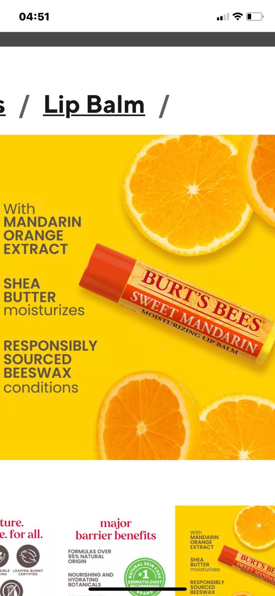 Burt's Bees Tatlı Mandalina dudak balmı, mandalina portakal özü, shea yağı ve sorumlu kaynaklı balmumu ile dudakları nemlendirir ve korur.