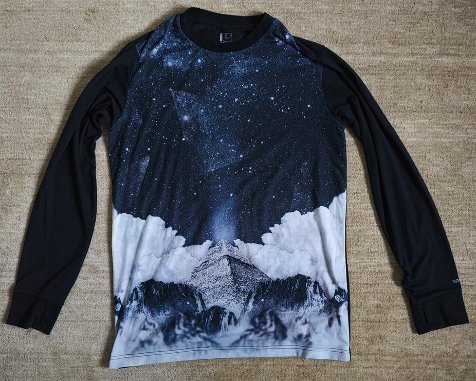 Erkekler için uzun kollu, yüksek yakalı ve bol kesim bir tişört. Lacivert renkte, dağlar ve yıldızlı gece baskısı bulunur. Kaygan sentetik kumaştan yapılmış, drapeli sokak stiline uygun. Mağaza satışı 5-6 bin TL. 4 kez giyildi.
