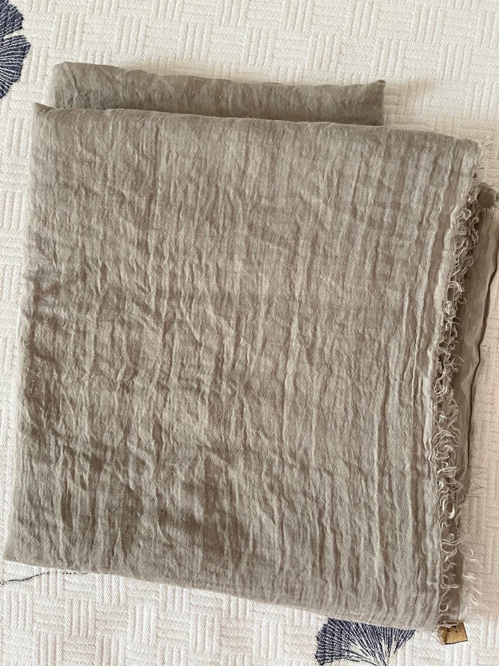 gri tonlarda, bürümcük kumaştan yapılmış, drapeli tasarıma sahip kadın şalı, rahat ve bohem tarzda. az kullanildi kusuru yok