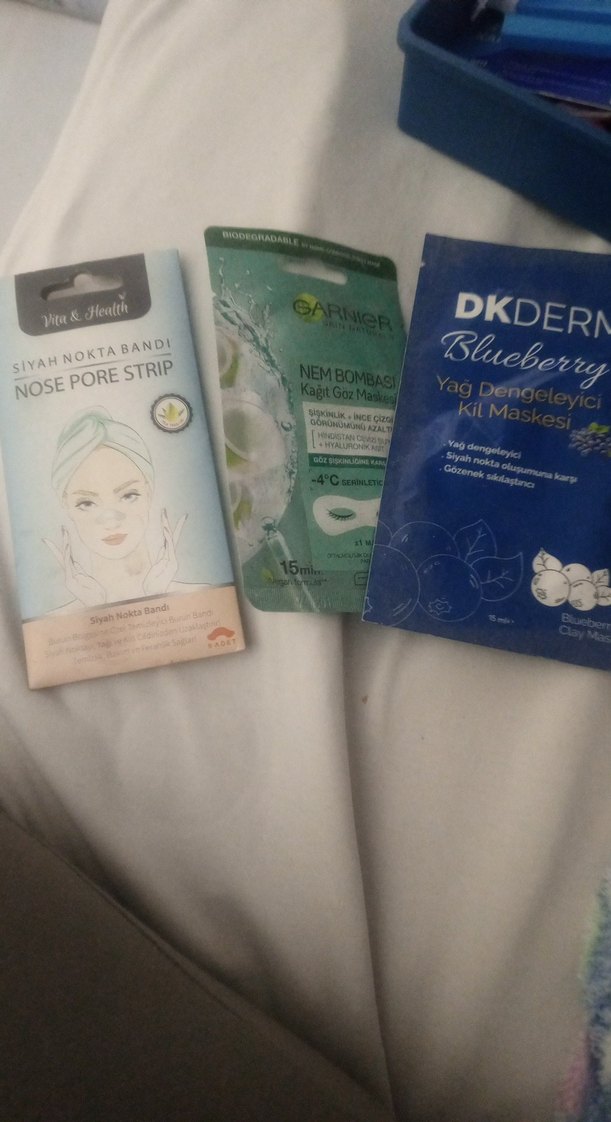 Burun gözenek bandı, nemlendirici göz maskesi ve yağ dengeleyici yaban mersini kil maskesi içeren cilt bakım seti.