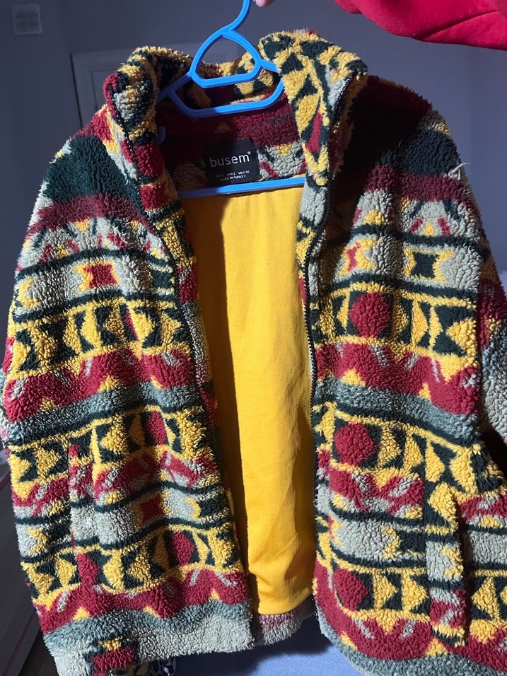 Busem markalı, desenli ve çok renkli, yüksek yakalı, uzun kollu, örgü dokulu yumuşak ve rahat kumaştan midi uzunlukta bol kesim ceket. Bohem ve retro tarzına uygundur.