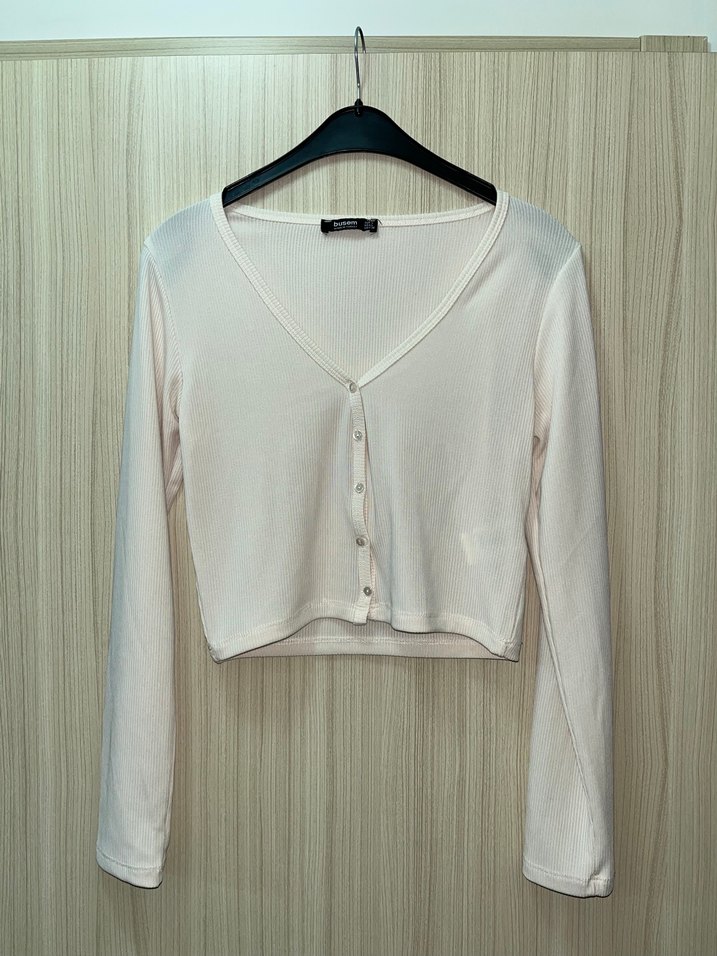 Busem marka, l beden, krem renk, düğmeli, uzun kollu, V yaka, crop üst.