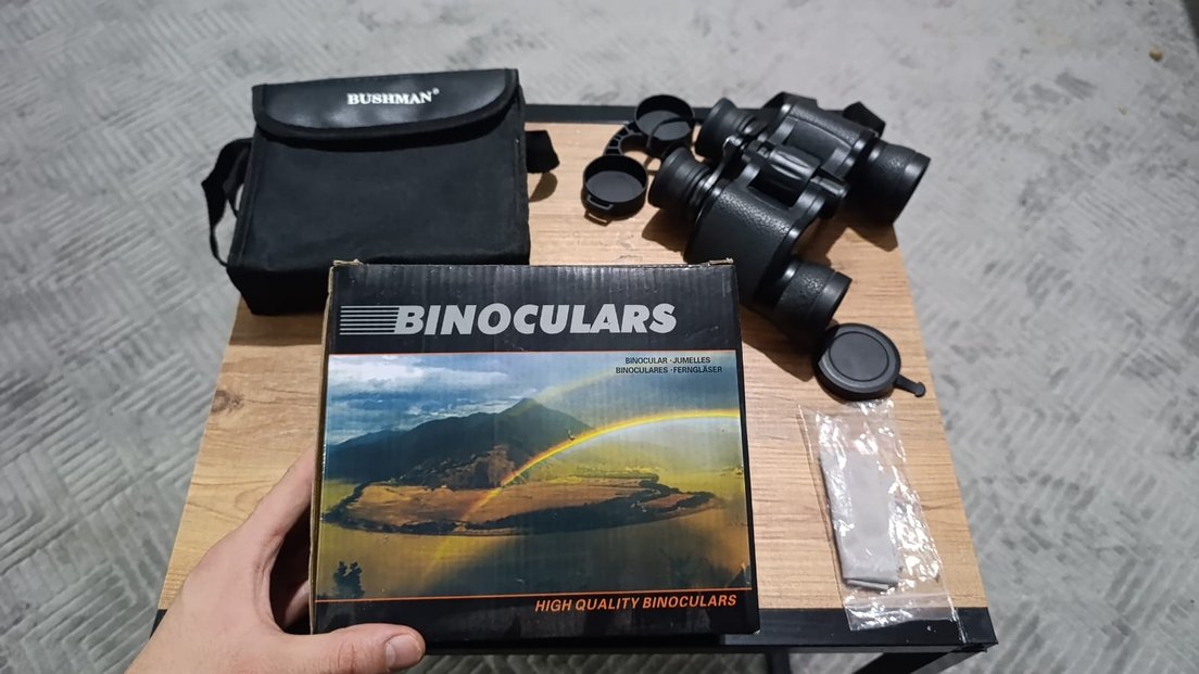 BUSHMAN markalı kaliteli dürbün, lens kapakları ve taşıma çantası ile birlikte.