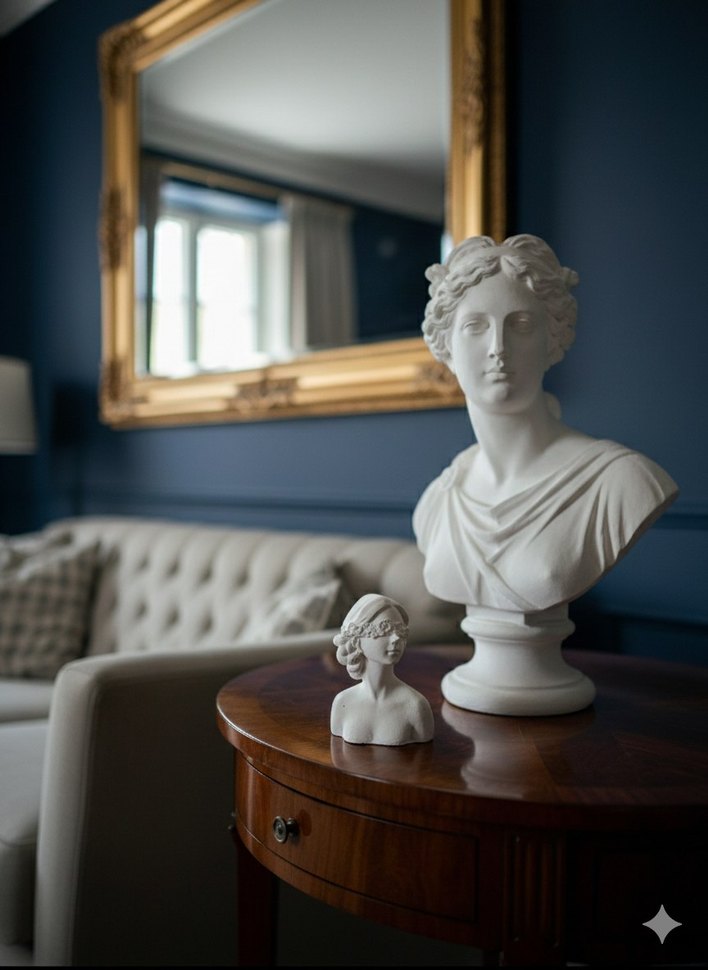 Lacivert duvarlarda beyaz büst heykeller ve çizgili vazoyu içeren klasik ve şık ev dekorasyonu. Görüntüde 3:15 zamanı görünür. ️