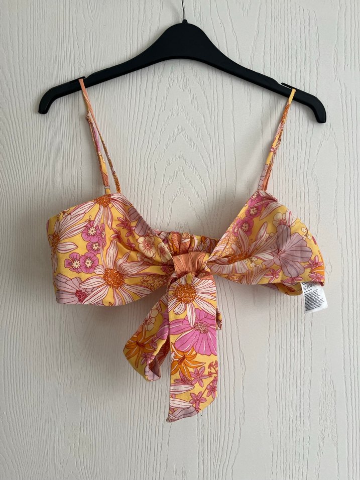 Bohem tarzı, pastel sarı bağcıklı kısa büstiyer . İnce ayarlanabilir askıları ve çiçek desenleri ile dikkat çekiyor.