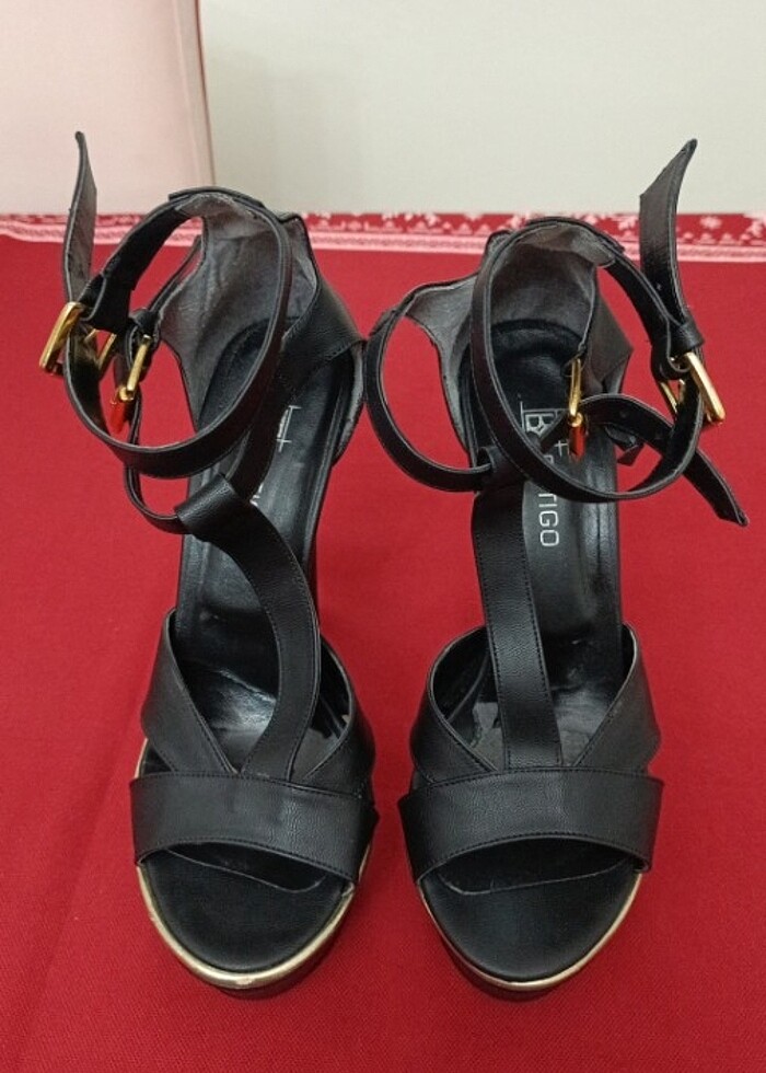 Siyah çift tokalı butigo marka yuksek topuklu bir kac sefer giyilmiş beklemeden dolayi astar kisminda hafif soyulma onun icin fiyat uygundur