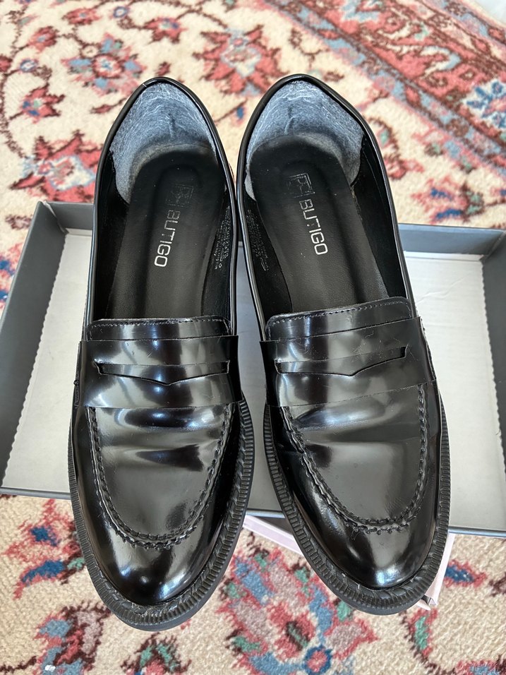 Butigo marka, parlak siyah kadın loafer ayakkabı. Blok topuklu ve pile detaylı, ofis kullanımı için uygun. Dayanıklı malzeme. Çok az kullanıldı. 38 numara. Kutu ile gönderilecektir. Çok severek aldım, rahat bir ayakkabı ancak dar kalıp olduğu için ayağımı sıktığından elden çıkarıyorum.