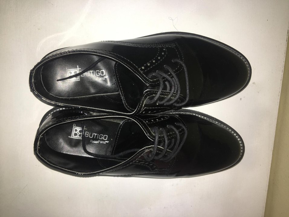 Butigo markalı, siyah, düğmeli erkek klasik ayakkabı. Dayanıklı kauçuk malzemeden üretilmiş, desensiz ve şık tasarım.