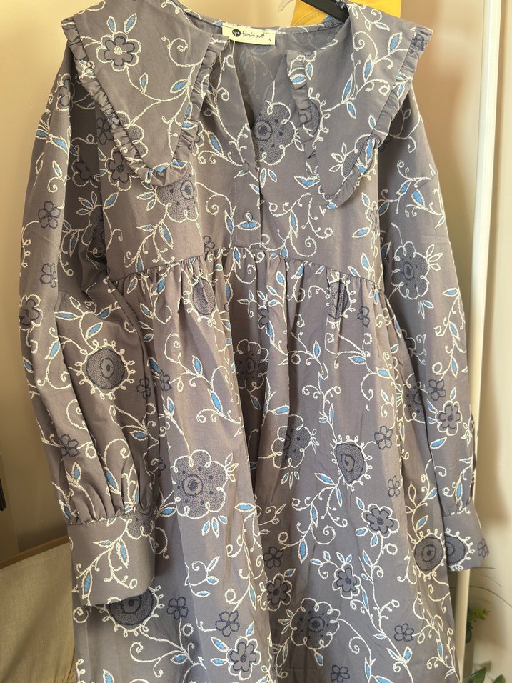 Bol kesim, uzun kollu ve yakalı elbise, düğmeli ve nakışlı çiçek desenlerine sahip yumuşak dokulu kumaftan yapılmıştır. Günlük kullanıma uygun vintage bohem tarzı sunar. Kusuru yok etiketlidir