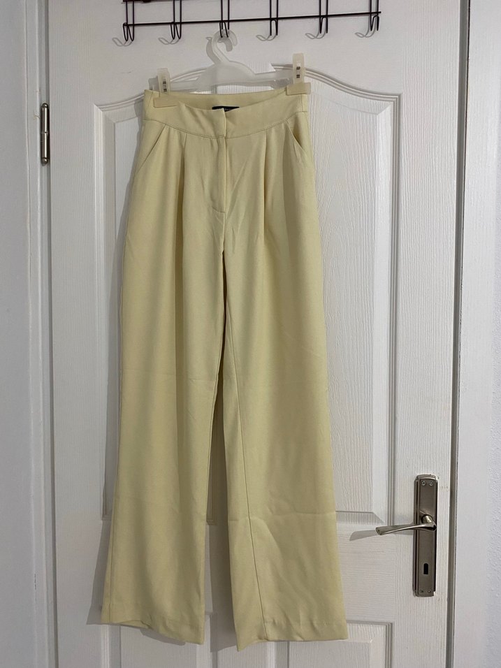 Bej renkte, midi boy, pilili ve regular fit kadın kumaş pantolon. Yumuşak ve ipeksi dokuda, desen içermeyen bu pantolon ofis ve sokak stiline uygundur. Hiç giyilmedi