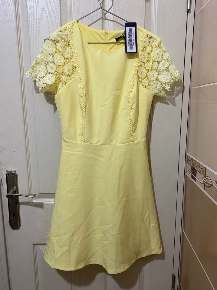Pastel sarı renkte, dantel kısa kollu, V yakalı, sentetik kumaştan yapılmış, klasik şıklıkta, vintage esintili midi boy dar kesim elbise.