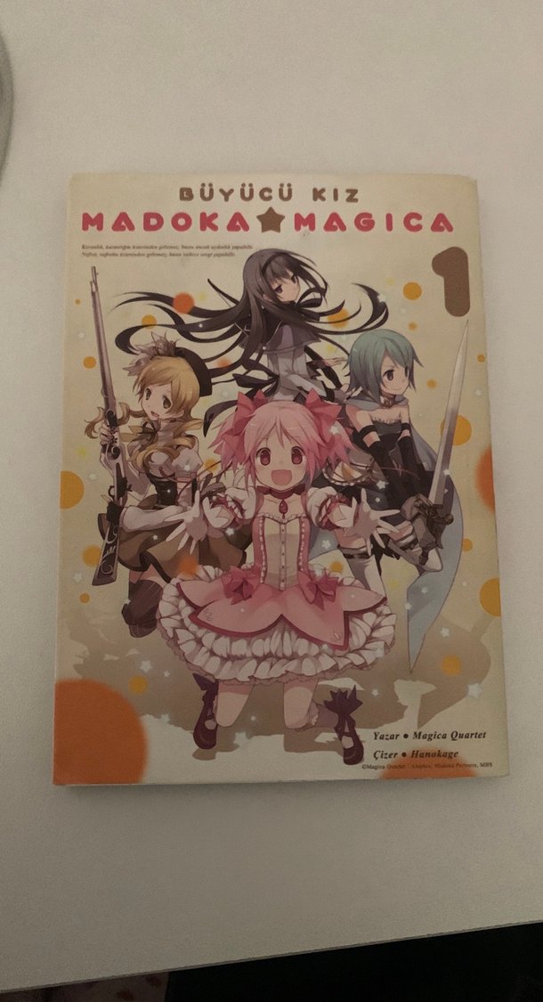 Büyücü Kız Madoka Magica çizgi romanının birinci cildi, detaylı anime tarzında sihirli kızları içerir. Kapakta dört karakter ve silahları yer alır. ✨