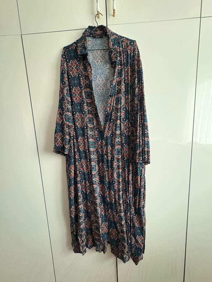 Uzun, bol kesim elbise, yakalı ve uzun kolludur. Tekstil kumaştan yapılmış, koyu renkli çok renkli batik desenli, drapeli tasarıma sahiptir, günlük kullanım için uygundur.