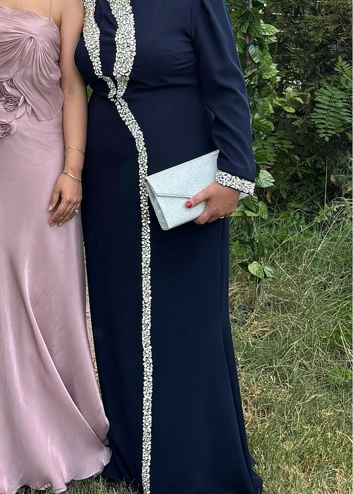 Annem kardeşimin düğününde giydi 46 beden lacivert, gümüş taşlı tesettür abiye. 48 bedene de olur annem 48 beden.