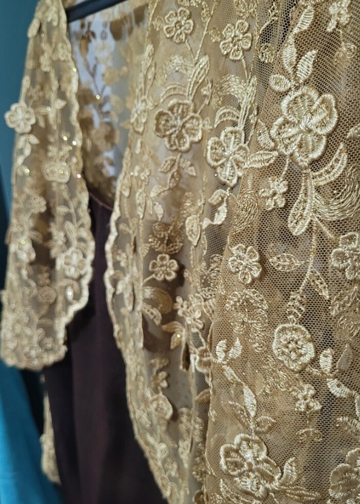 Özel dikim. Saten elbise ve simli bolero. Hic bir sorunu yoktur.