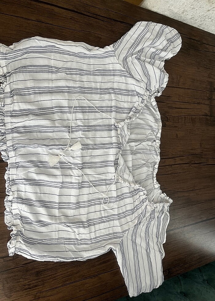 Crop tarzı kısa lastikli omuzları açık kollarımda yırtmaç detayı var çok rahat tiril bir kumaş.