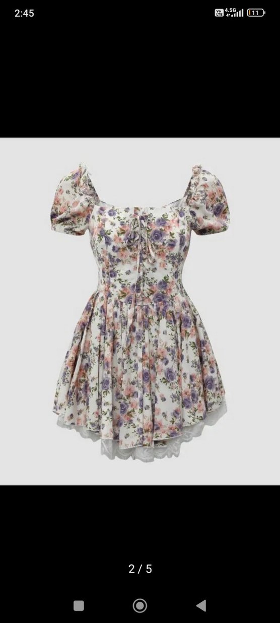 Çiçek desenli, kısa kabarık kollu, dantel detaylı bol kesim mini elbise. Yumuşak sentetik kumaştan, askısız yakalı ve pastel renklerde, düğünler için uygun. mevcutta 2xl ve 3xl var