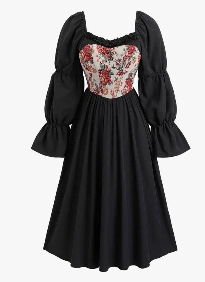 Siyah uzun gece elbisesi, çiçek desenli straplez korse ve fırfırlı, bol uzun kollara sahip, gotik ve bohem tarzı romantik akşamlar için uygundur. Büyük bedendir esnek değildir