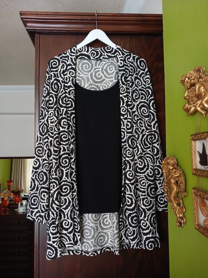 sifir ayarinda Icli disli siyah beyaz takim ic kismindaki siyah parca ust parcaya dikilidir.siyah parcanin tek taraf etek genisligi 69 cm omuzdan etek ucuna uzunluk 65 cm ustteki ceket iki koltukalti arasi genisligi 66 cm omuzdan etek ucuna uzunlugu 81 cm koltukaltindan etek ucuna uzunluk 53cm omuzdan koltukaltina kolacikligi 26cm omzdan kolucuna uzunluk 60cm kolgenisligi 20-17-13 olculere bakarak alim yapiniz marka temsili
