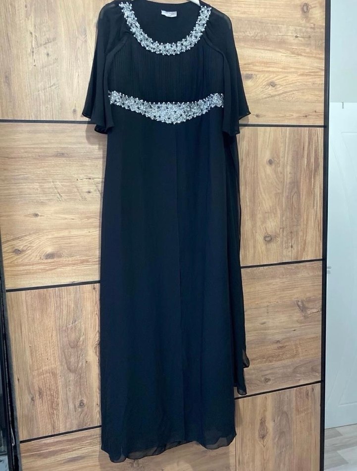Drapeli ve nakış işlemeli siyah uzun abiye elbise, tekne yaka ve kısa kolludur. Bol kesimiyle rahatlık sağlar, düğünler için uygundur.BİR DEFA GİYİLDİ ARKASINA PELERİN YAPILMIŞTIR ÖNDENDE UZUN YIRTMAÇLI TÜLÜ VARDIR YANDAN FERMUARLIDIR