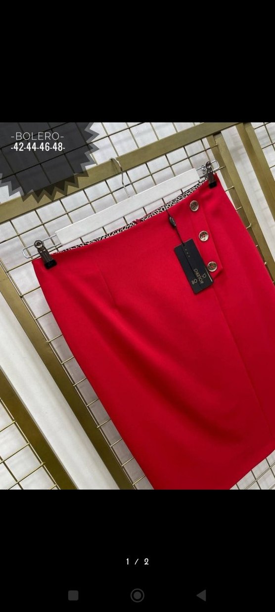 Düğmeli detaylı, parlak kırmızı mini kalem etek, şık ofis kombinleri için uygundur. 42-48 beden aralığında mevcuttur.
