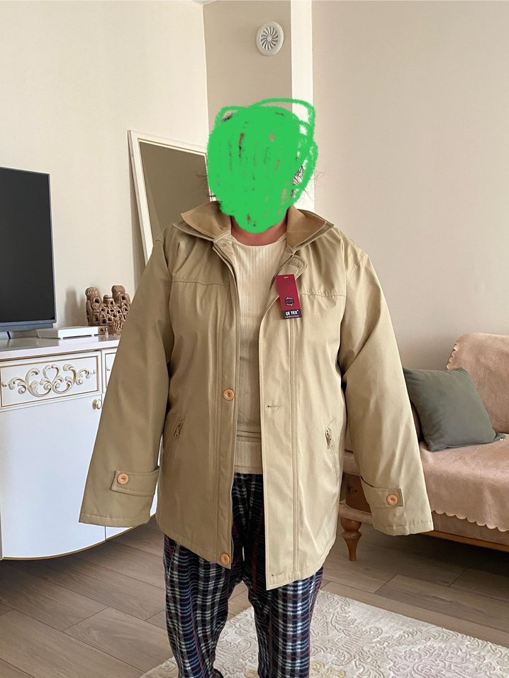 Bej renkte, düğmeli ve notched yaka detaylı erkek midi ceketi. Uzun kollu, bol kesim ve sentetik kumaştan üretilmiştir. Kalın sıcak tutar bedeni büyük geldi iade edemedik çok güzel bir montt etiketi üstünde. Markası zara değil mağazadan alındı