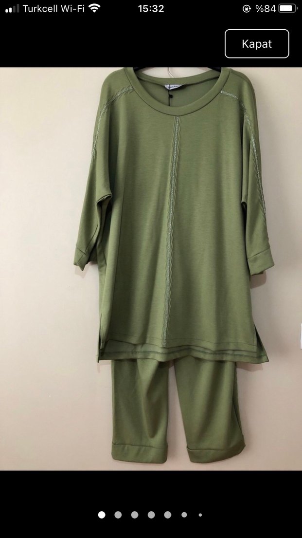 Kumaş model licralı bol ve salaş kesimdir Nakış detayları olan şık takım yarasa kol Göğüs 130 Kolboyu 60 Boy 80 cm Pantolon yüksek bel Lastikli cep detay Bel 80Basen 135 Boy 110 bol paça Bedenler Mevcuttur 52.54