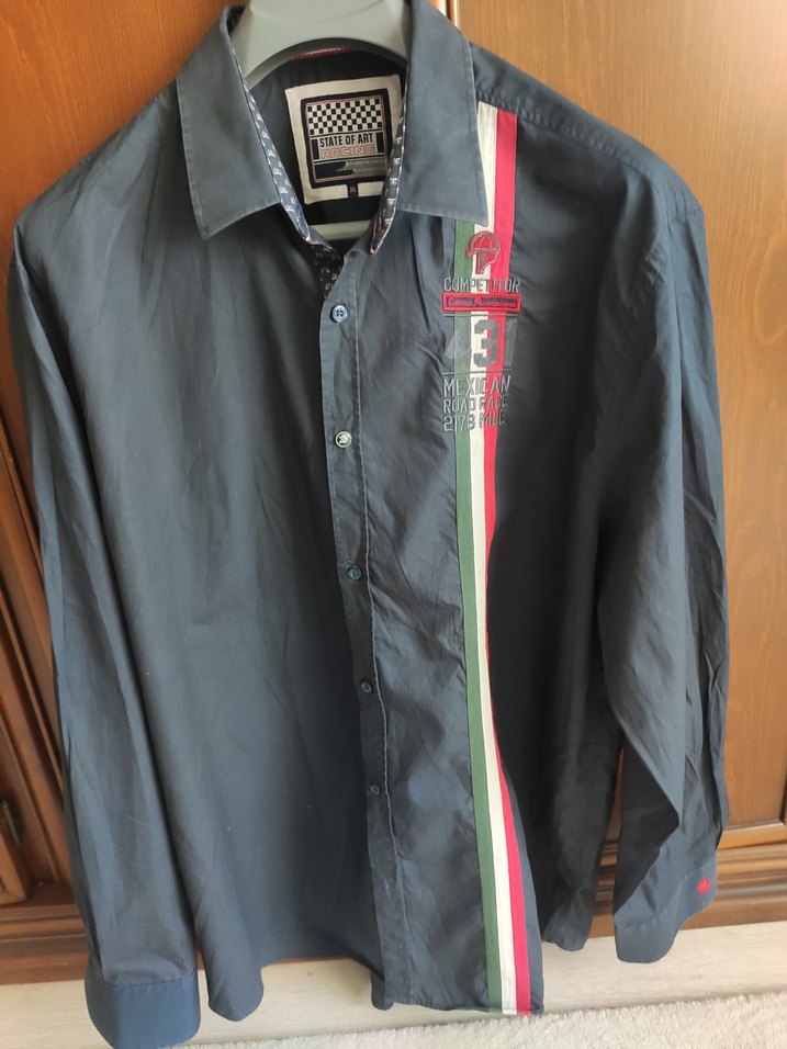 Çok az kullanılmış, % 100 pamuk, göğüs 68, boy 81, 3 xl uzun kollu gömlek Gri renk, düğmeli uzun kollu erkek gömleği. Notlu yaka ve baskılı dikey şerit deseni bulunur.