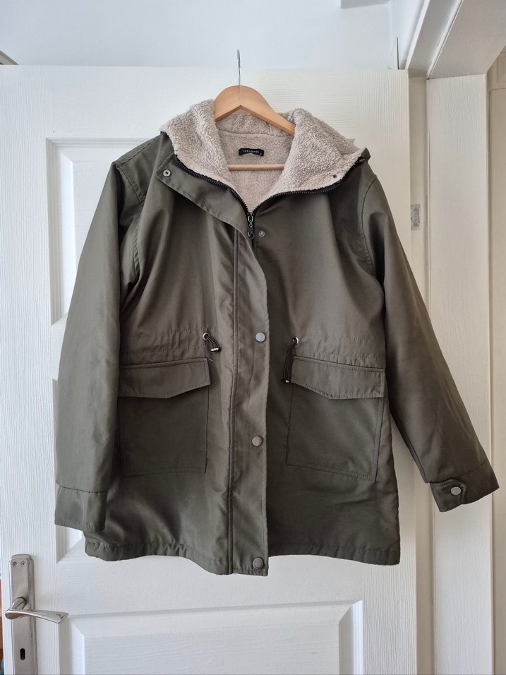Haki renk, 44 beden, regular kalıp, kapüşonlu, içi kürklü kaban. Temiz durumdadır.