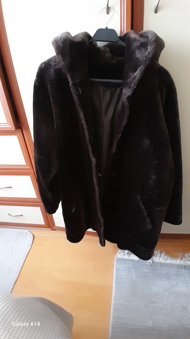 Kahverengi midi uzunlukta kadın suni kürk kaban, yumuşak kürk detaylı ve bol kesimlidir. Kapusonlu uzun kollu, Günlük kullanıma uygundur.