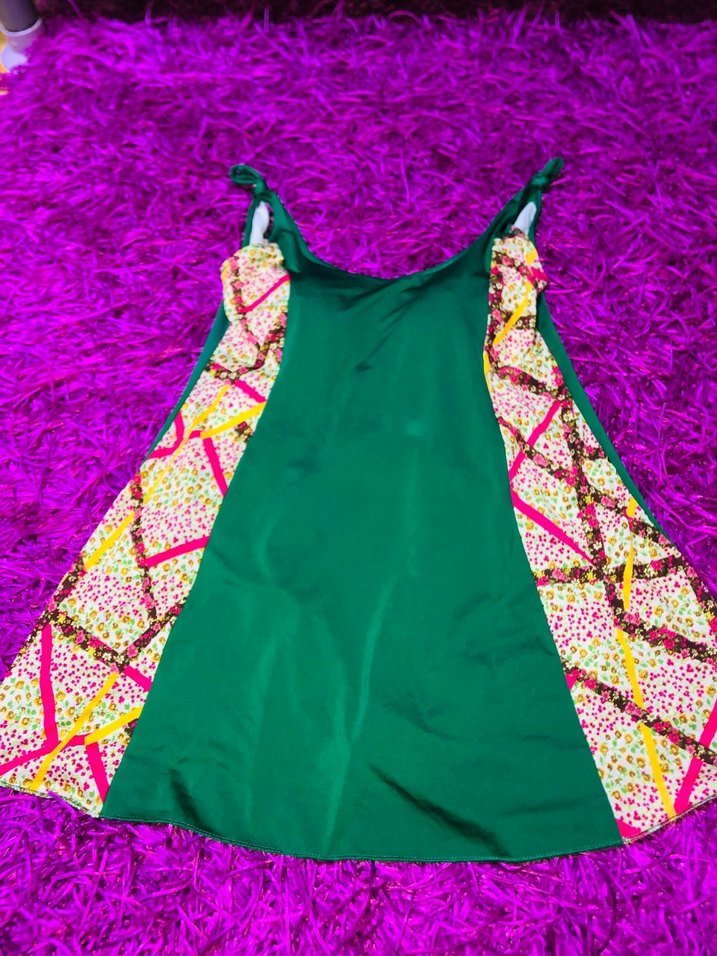 Sentetik kumaştan yapılmış, straplez, oturan kesim ve fırfır detaylı çok renkli kız çocuk yeleği.