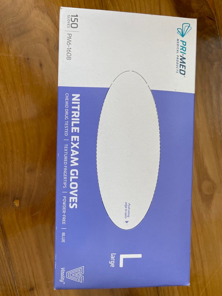 150 adet büyük beden, mavi renkli, pudrasız ve dokulu nitril muayene eldiveni içeren kutu. CE ve FDA onaylıdır.