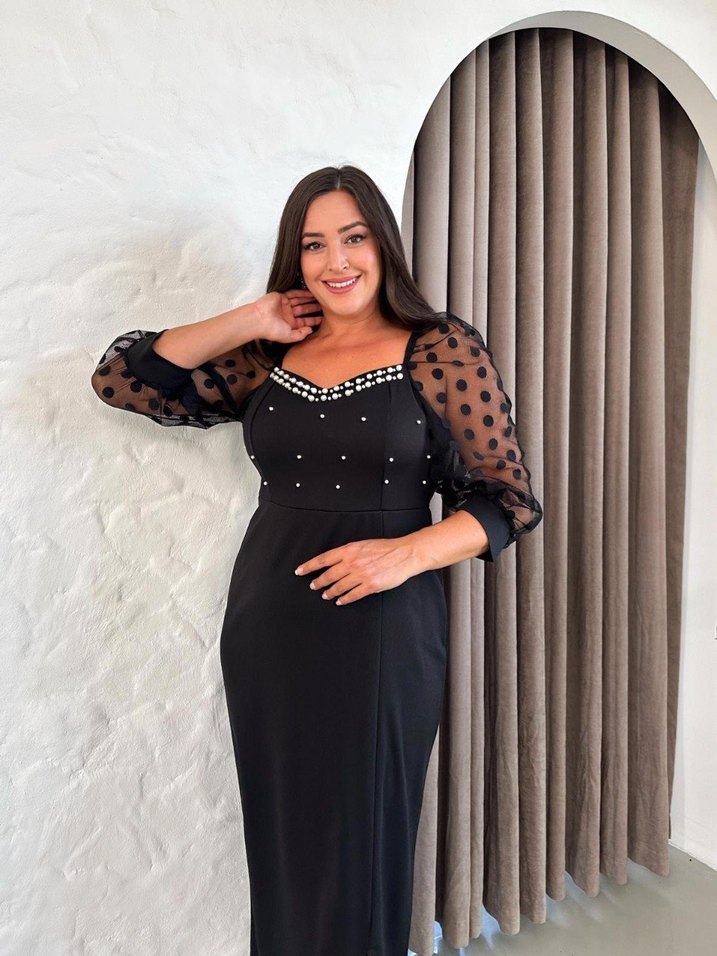 Kadın büyük beden kalp yaka İnci detaylı puantiyeli tül kol yırtmaçlı abiye elbise siyah 44-46-48-40-52-54 Beden aralığı mevcut