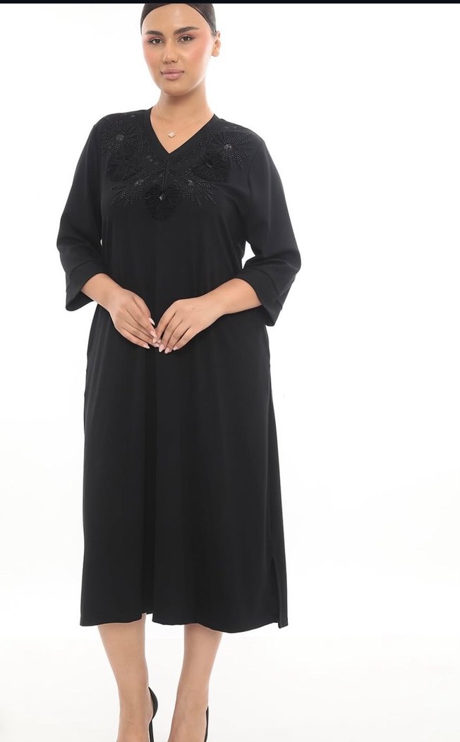 Kumaş model licralı bol ve salaş kesimdir v yaka Nakış ve boncuk işleme detayları olan şık Elbise Göğüs 135 Kolboyu 45 Boy 120 cep detay yanlar yırtmaçlı Elbise Bedenler 50.52.54vardır